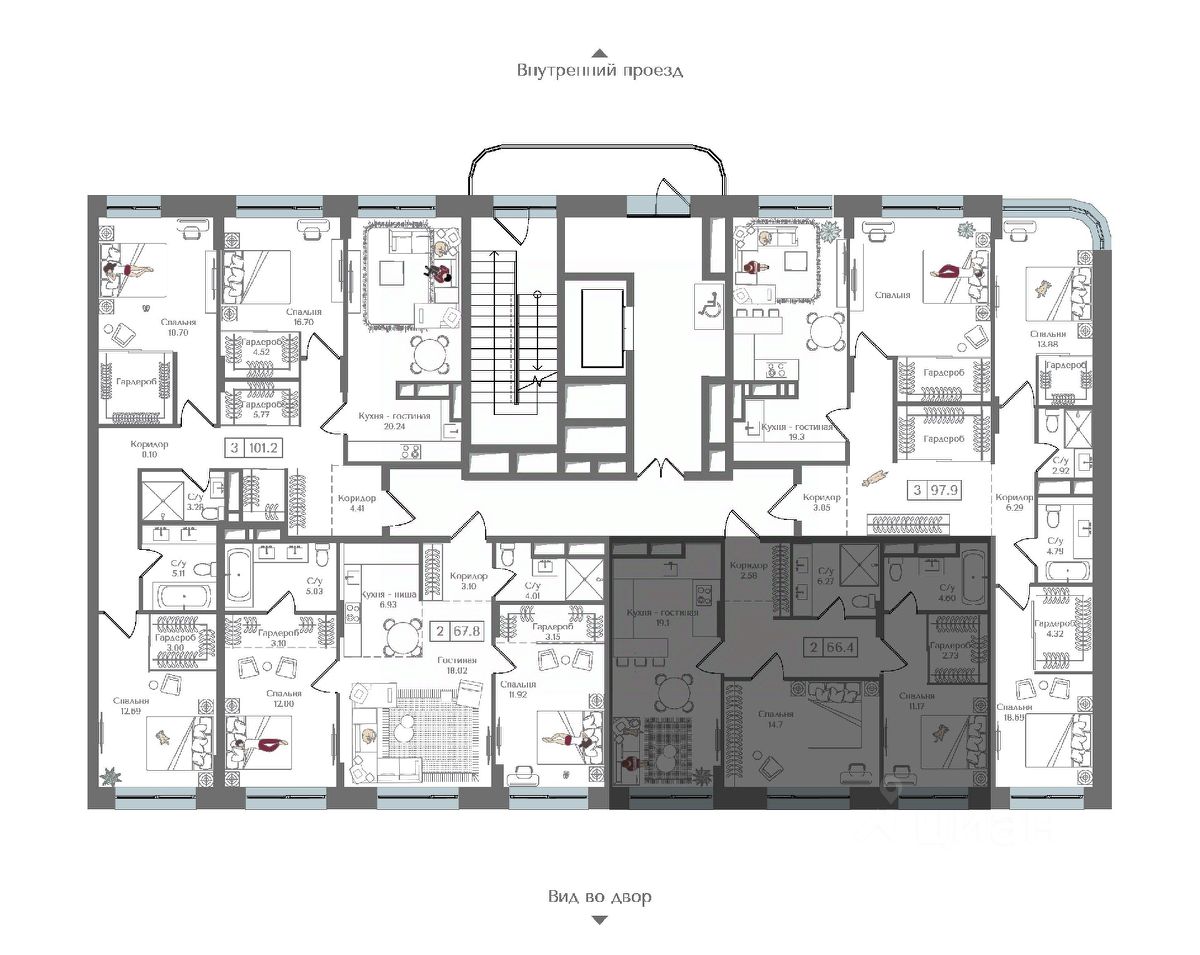 Внутренний двор 1,5 га функциональное и безопасное пространство для игр, работы и занятий спортом. Пешеходный променад для прогулок. Дома переменной этажности. Есть подземный паркинг.