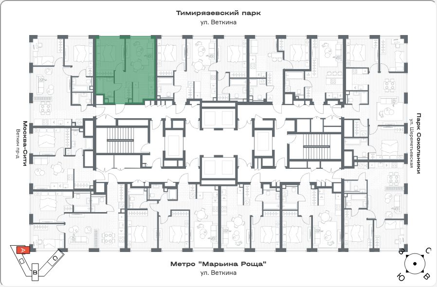 Проект расположен на границе с ЦАО в районе Марьина Роща на улице Веткина. В шаговой доступности находится метро Марьина роща (5 минут), парки "Останкино" и "Сокольники" (15 минут). До центра столицы время в пути составит 15 минут на авто.