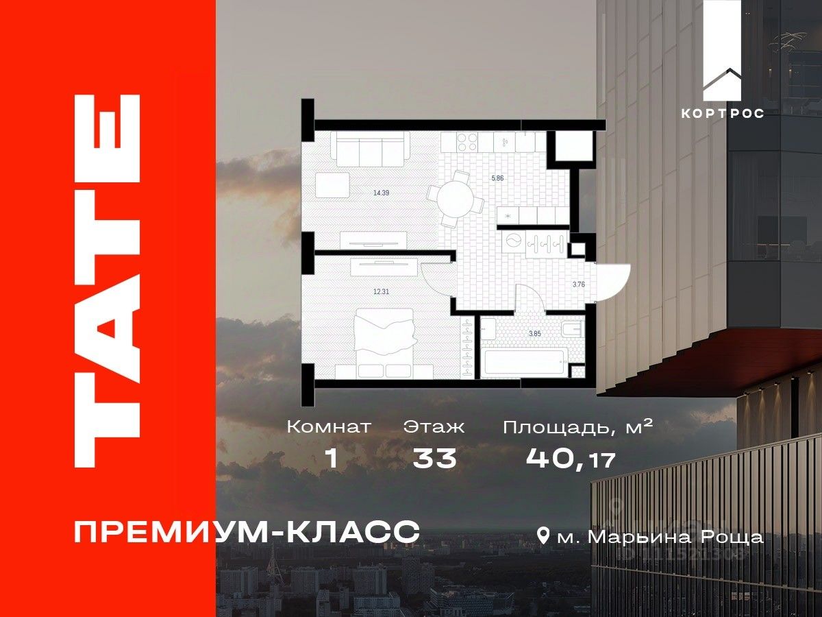 Продается 1-комнатная квартира от застройщика в ЖК премиум-класса TATE на 33 этаже. Общая площадь 40,17 м². Отделка предчистовая (white box). 1 санузел. Вид из окна на Тимирязевский парк. Башня A.