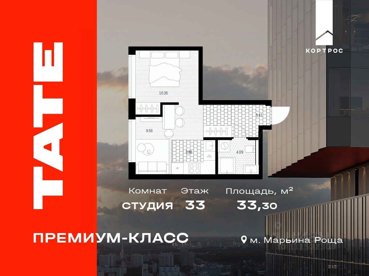 Продается 1-комнатная квартира от застройщика в ЖК премиум-класса TATE на 33 этаже. Общая площадь 33,3 м². Отделка предчистовая (white box). 1 санузел. Вид из окна на Тимирязевский парк. Башня A.