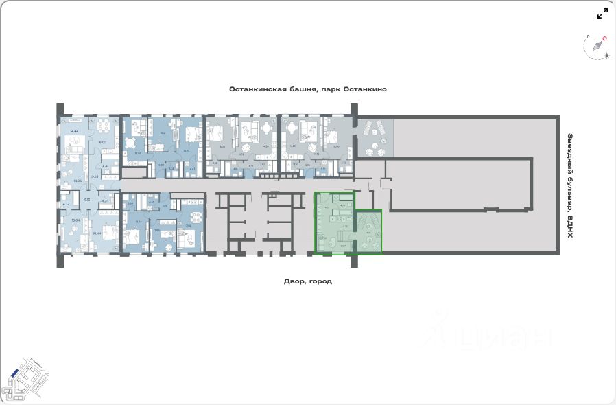 ЖК расположен в тихом зелёном районе Останкино — 10 мин пешком до метро "Алексеевская", на автомобиле — 6 мин до ТТК. Благоустроенный двор с детскими и спортивными площадками, дизайнерский подъезд с панорамными окнами. В проекте реализуется концепция "город в городе": вся необходимая инфраструктура на первых этажах зданий, запроектирован комьюнити-центр. В 2025 году на территории ЖК откроется детский сад. В пешей доступности продуктовые магазины, кафе и рестораны, школы и поликлиники. В ближайшем окружении крупные парки — ВДНХ, парк "Останкино", Ботанический сад, Сокольники.