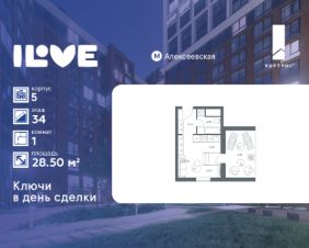 В продаже студия 27,98 кв.м с террасой на 34 этаже пятого корпуса семейного жилого квартала бизнес-класса iLove. Высота потолков 3,05 м, квартира без отделки.
