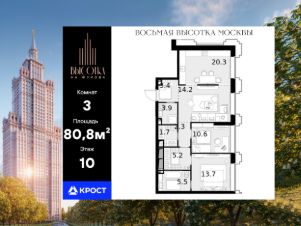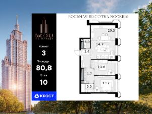 Трёхкомнатная квартира площадью 80,80 кв. м. на 10 этаже нового дома премиум-класса Высотка на Жукова