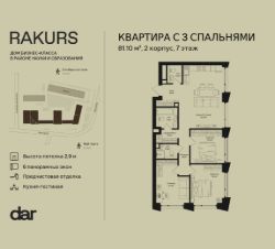 Продаётся 3-комнатная квартира 81.10 м² в жилом комплексе Ракурс. Квартиру отличают панорамное остекление, потолки 2,9 м, улучшенная шумо и воздухоизоляция. Дом сдаётся в 1 квартале 2028 года, продажи проходят через эскроусчета. Подземный паркинг, коворкинг, закрытая благоустроенная территория с фонтаном и артобъектами. Гибкие условия покупки.