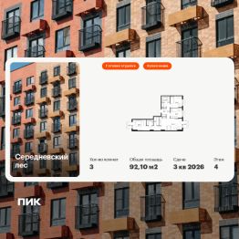Продаётся 3-комн. квартира площадью 92,1 кв.м на 4 этаже 9 этажного дома (Корпус 4.3, Секция 5) проекта ПИК Середневский лес. Светлый просторный подъезд на уровне земли, функциональная планировка, большие окна, c отделкой.
