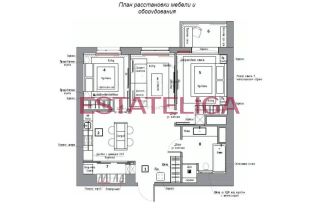 Функциональная планировка апартамента, разработанная по индивидуальному дизайн-проекту: просторная кухня-гостиная, две изолированные спальни, санузел с ванной и душем, гардеробная комната. В каждой зоне оборудованы места для хранения. Кухонная зона плавно перетекает в гостиную, где расположилась ТВ-зона.