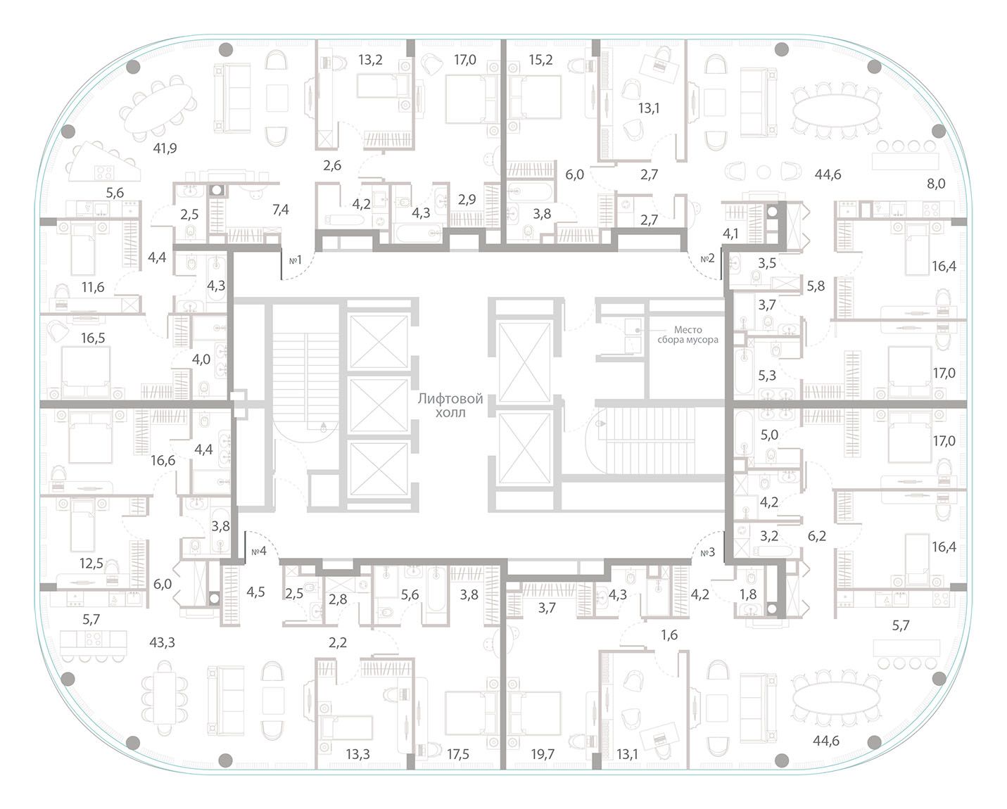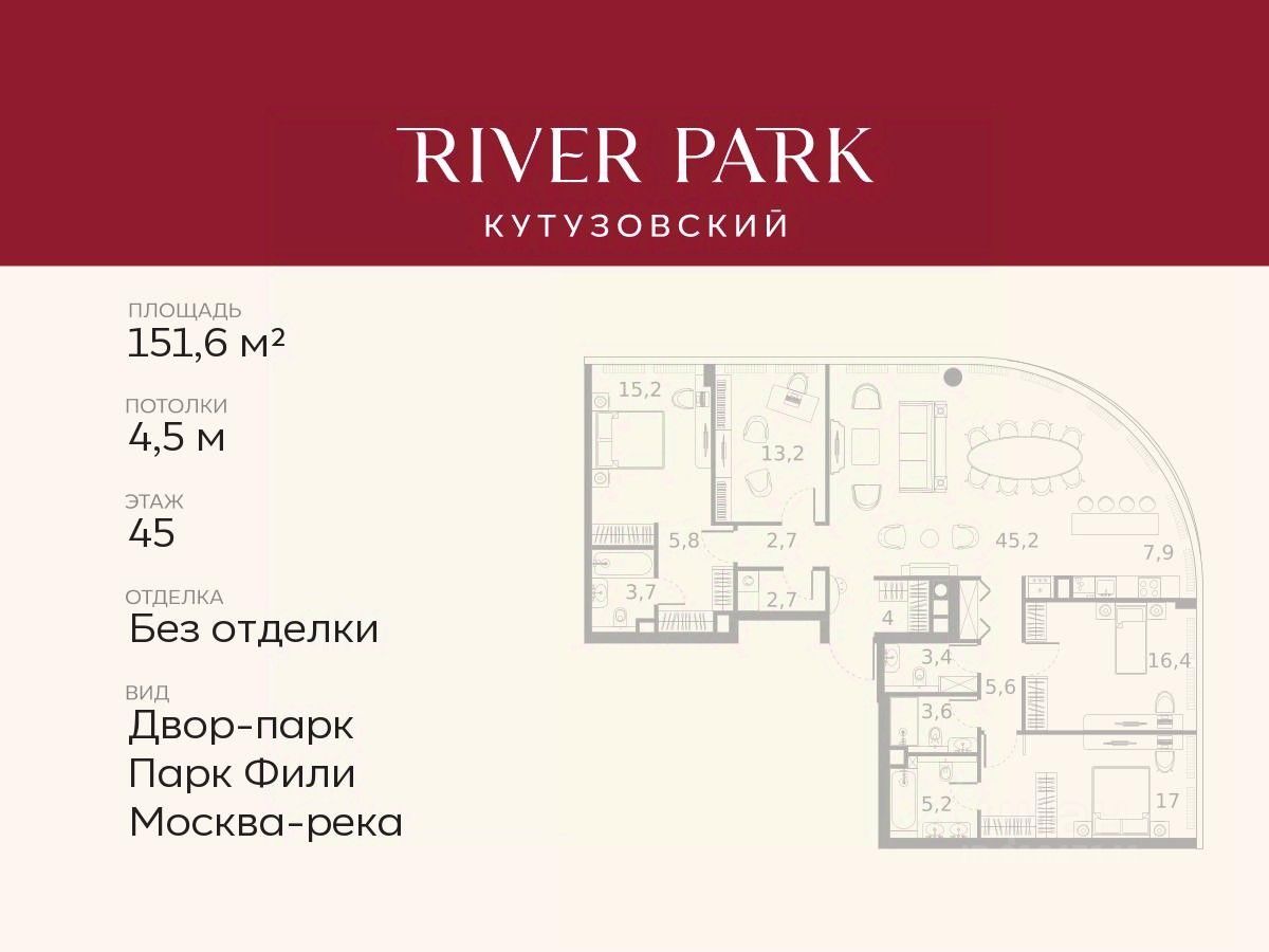 Продается 4-к квартира площадью 151.6 кв.м. на 45-м этаже в жилом комплексе премиум-класса River Park Кутузовский в Башне Amber Tower