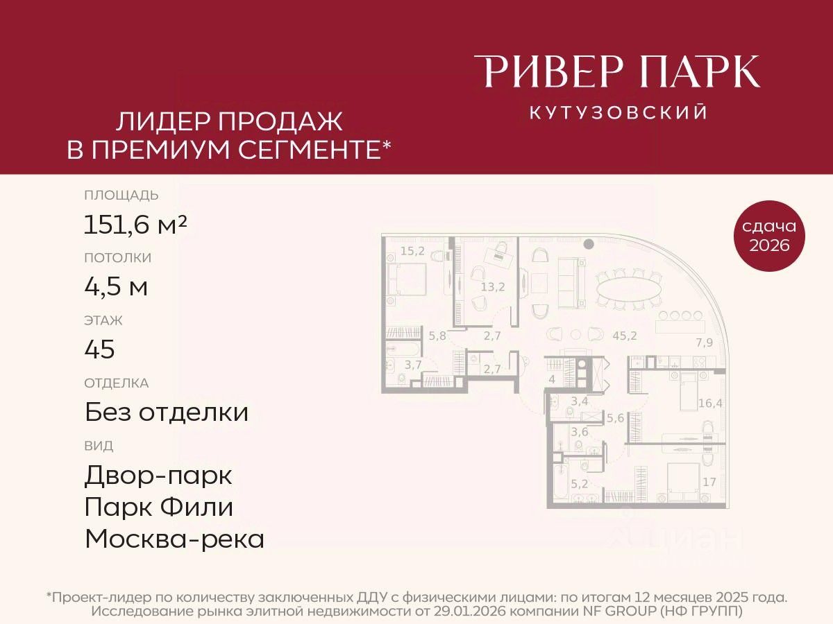 Продается 4-к квартира площадью 151.6 кв.м. на 45-м этаже в жилом комплексе премиум-класса Ривер Парк Кутузовский в Башне Янтарь