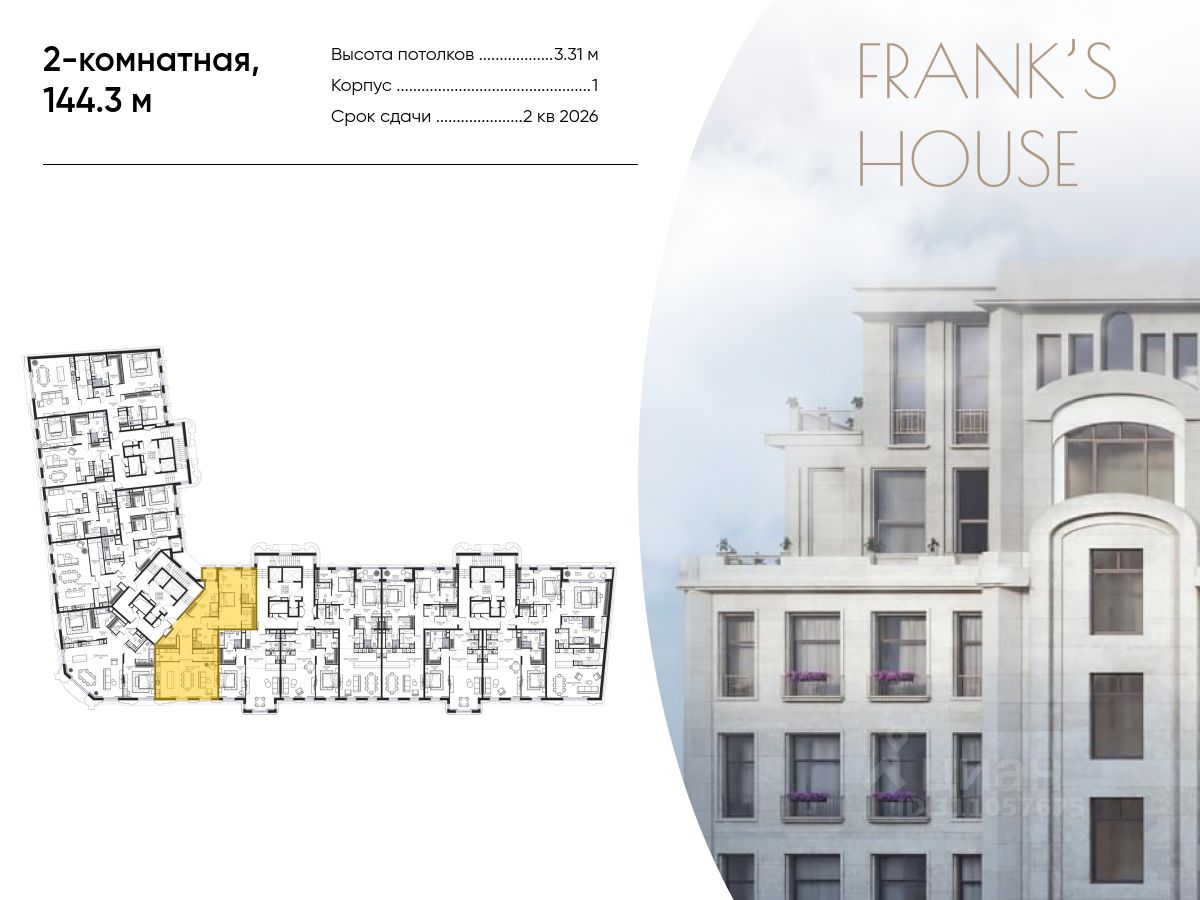 Продается двухкомнатная квартира в ЖК "Дом Франка" по адресу Москва, ЦАО, Мещанский, Большой Кисельный переулок, д. 11, корп. 1 Общая площадь квартиры - 144,30 кв.м., этаж 3. Стоимость квартиры - 249 248 207 р.