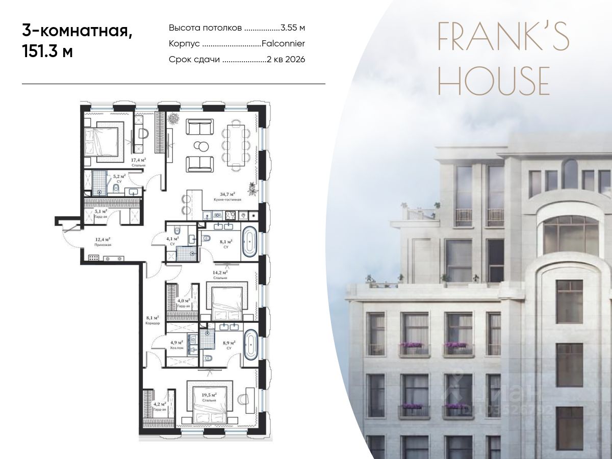 Продается трехкомнатная квартира в ЖК "Дом Франка" по адресу Москва, ЦАО, Мещанский, Большой Кисельный переулок, д. 11, корп. 3 Общая площадь квартиры - 151,30 кв.м., этаж 2. Стоимость квартиры - 250 745 240 р.