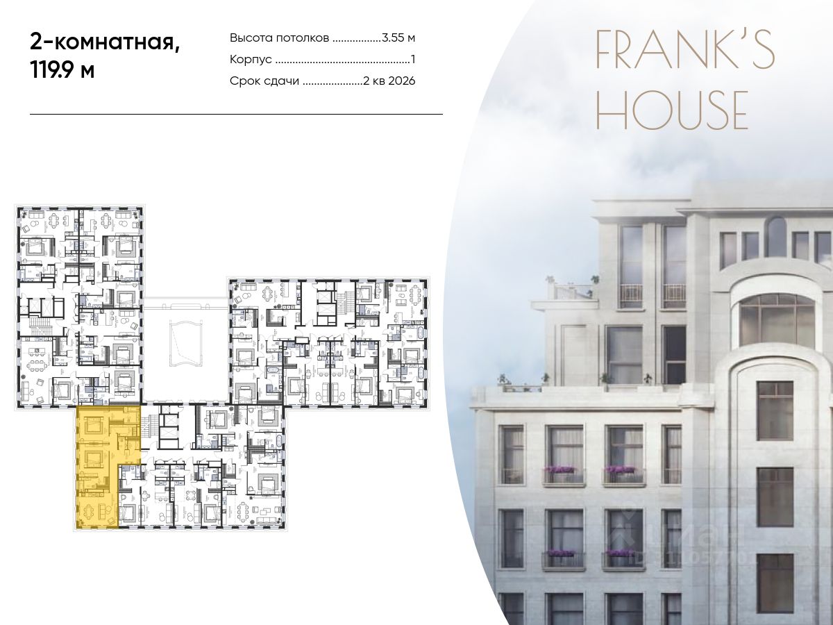 Номер лота: 33 Продается двухкомнатная квартира в ЖК "Дом Франка" по адресу Москва, ЦАО, Мещанский, Большой Кисельный переулок, д. 11, корп. 3 Общая площадь квартиры - 119,90 кв.м., этаж 2. Стоимость квартиры - 199 903 387 р. Представляем вашему вниманию Franks House - триумфальное возвращение любимого московского стиля модерн в классическом варианте и новом прочтении. Два потрясающих проекта: House Frank - реконструкция знаменитого торгового дома империи Франков начала прошлого века и House Falconnier - современное прочтение элитной недвижимости. Два самодостаточных шедевра, объединенные общей концепцией. House Frank и абсолютное новое, современное трехсекционное здание House Falconnier. В центре архитектурной композиции проекта - приватный зеленый внутренний двор с ландшафтным дизайном. Всего в комплексе запланировано 147 премиальных резиденций, площадью от 63 до 263 кв. метров с возможностью объединения. На первых этажах расположены квартиры с частными палисадниками, обрамленными живой изгородью, верхние же этажи занимают просторные пентхаусы с простыми углубленными террасами и панорамным остеклением, дающие возможность любоваться историческими и культурными памятниками Москвы, не выходя из дома. Подземный паркинг жилого комплекса располагает достаточным количеством мест для удобного размещения ваших транспортных средств. Территория Franks House находится под круглосуточной охраной и видеонаблюдением. Во всех резиденциях действует единая система обслуживания дома. House Falconnier. Современное прочтение московского модерна. Не случайно второй дом нашего комплекса элитных резиденций носит имя Фальконье. Испанский архитектор и философ стиля модерн Антонио Гауди считал, что величайшее свойство произведения искусства - гармония, которая в пластических искусствах рождается из света. Свет создаёт рельеф и украшает, а архитектура - это упорядочение света. Швейцарец Гюстав Фальконье - создатель выдувных стеклянных кирпичей, названных его именем, подарил мировой архитектуре тот самый свет, который зодчие искали веками. Следуя традициям, в работе над House Falconnier мы используем не только натуральный камень, но и стеклянные произведения искусства Фальконье, возвращая Москве её нарядный роскошный модерн во всех деталях. Ключевые преимущества: - элитные резиденции в историческом центре столицы, на Бульварном кольце; - 147 резиденций, площадью от 63 до 263 (с возможностью объединения) - возрождение культового московского стиля модерн; - просторные пентхаусы с террасами и панорамным остеклением на верхних этажах; - зона патио для квартир на первом этаже; - респектабельная входная группа; - лобби с отделкой из натурального камня, арочные потолки холла из стеклянного кирпича, натуральное дерево; - собственный бассейн, SPA, хаммам, фитнесс-зона, зона ожидания и переговоров, галерея; - конференц-зал и кафе-кондитерская для деловых и неформальных встреч; - круглосуточная охрана и видеонаблюдение; - единая система сервисного обслуживания дома. Архит