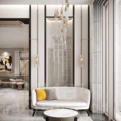 - лобби с отделкой из натурального камня, арочные потолки холла из стеклянного кирпича, натуральное дерево;