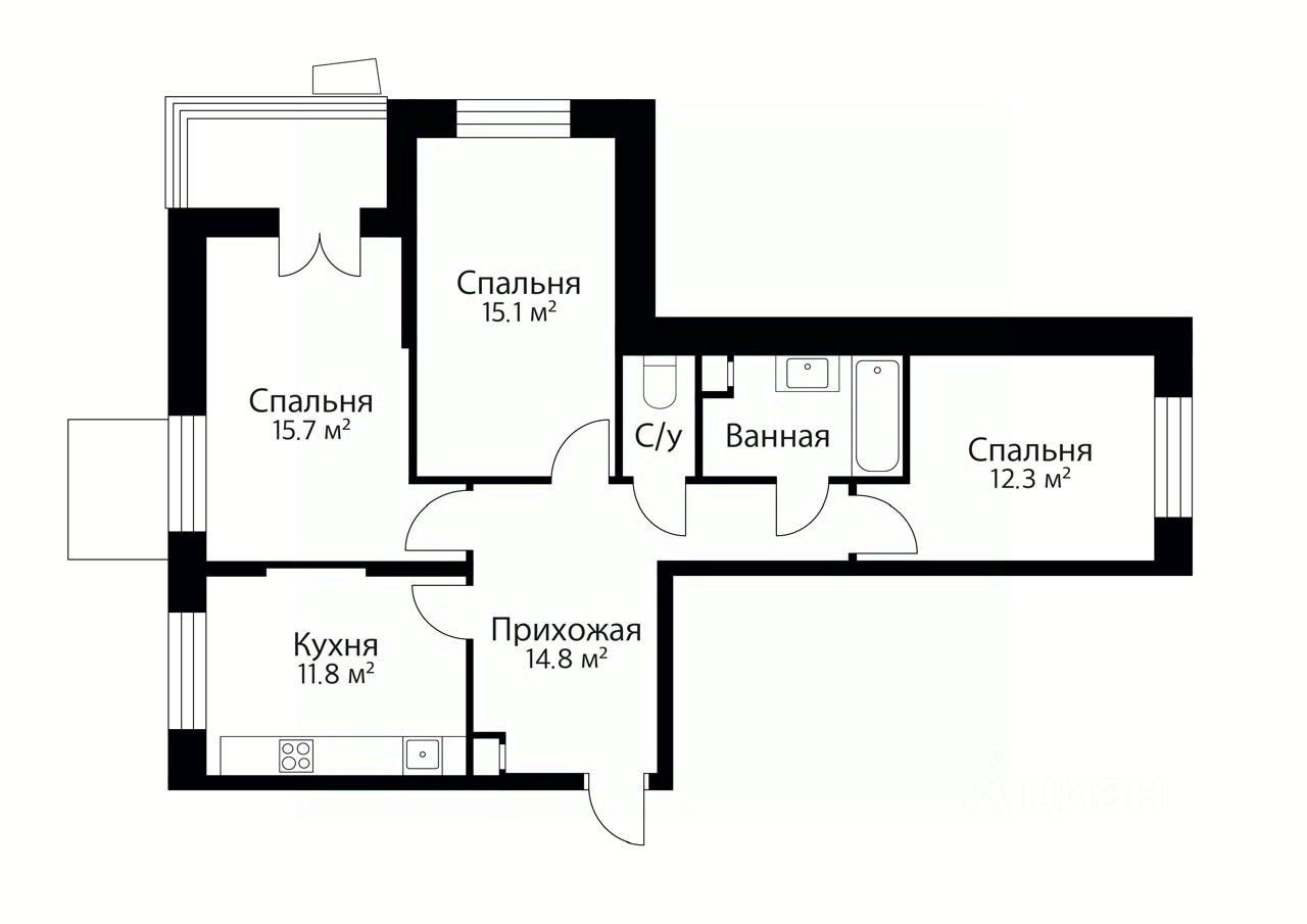 - комнаты 15,7 кв.м., 15,1 кв.м., 12,3 кв.м.;