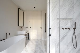 В каждой квартире установлены кухни от итальянского бренда Cesar со встроенной бытовой техникой премиальной линейки Smeg. Кухонный остров, столешница и фартук кухни выполнены из эксклюзивного итальянского мрамора Arabescato Grigio Orobico, одним из лучших видов мрамора на итальянском рынке натуральных отделочных камней.