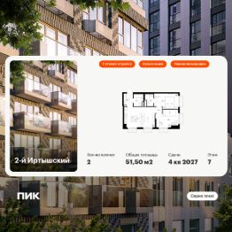 Продаётся 2-комн. квартира площадью 51,5 кв.м на 7 этаже 20 этажного дома (Корпус 1.7, Секция 7) проекта ПИК 2-й Иртышский. Светлый просторный подъезд на уровне земли, функциональная планировка, большие окна, c отделкой.