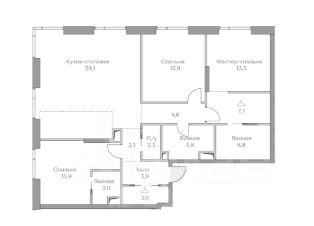 В квартире есть просторная угловая кухня-гостиная площадью 39 кв. м, что позволяет комфортно обустроить зону для готовки и столовую.