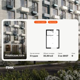 Продаётся квартира-студия площадью 25,6 кв.м на 9 этаже 9 этажного дома (Корпус 3.3, Секция 3) проекта ПИК Ильинские луга. Светлый просторный подъезд на уровне земли, функциональная планировка, большие окна, c отделкой.