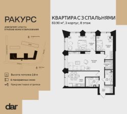 Продаётся 3-комнатная квартира 83.90 м² в жилом комплексе Ракурс. Квартиру отличают панорамное остекление, улучшенная шумо и воздухоизоляция. Дом сдаётся в 1 квартале 2028 года, продажи проходят через эскроусчета. Подземный паркинг, коворкинг, закрытая благоустроенная территория с фонтаном и артобъектами. Гибкие условия покупки.