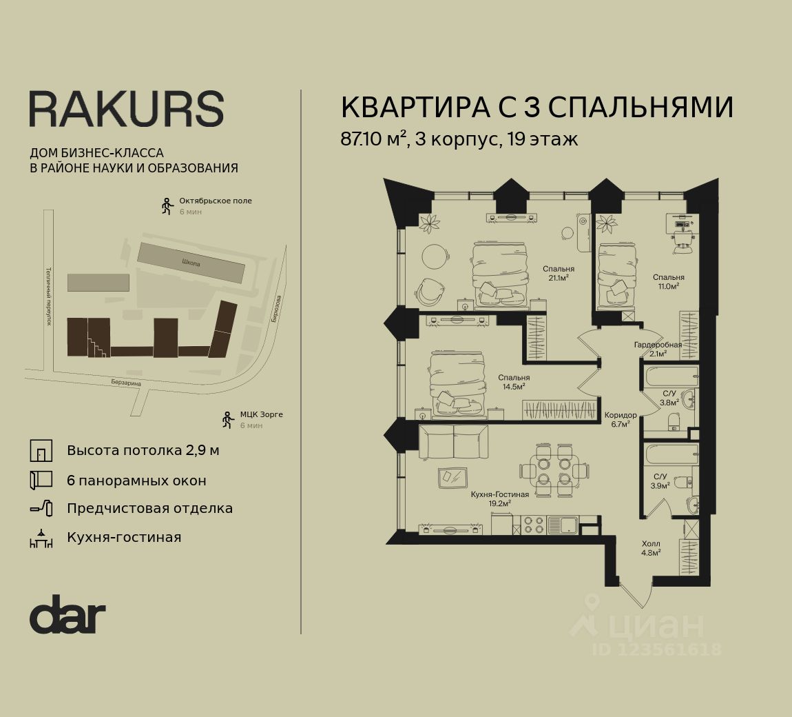 Продаётся 3-комнатная квартира 87.10 м² в жилом комплексе Ракурс. Квартиру отличают панорамное остекление, потолки 2,9 м, улучшенная шумо и воздухоизоляция. Дом сдаётся в 1 квартале 2028 года, продажи проходят через эскроусчета. Подземный паркинг, коворкинг, закрытая благоустроенная территория с фонтаном и артобъектами. Гибкие условия покупки.