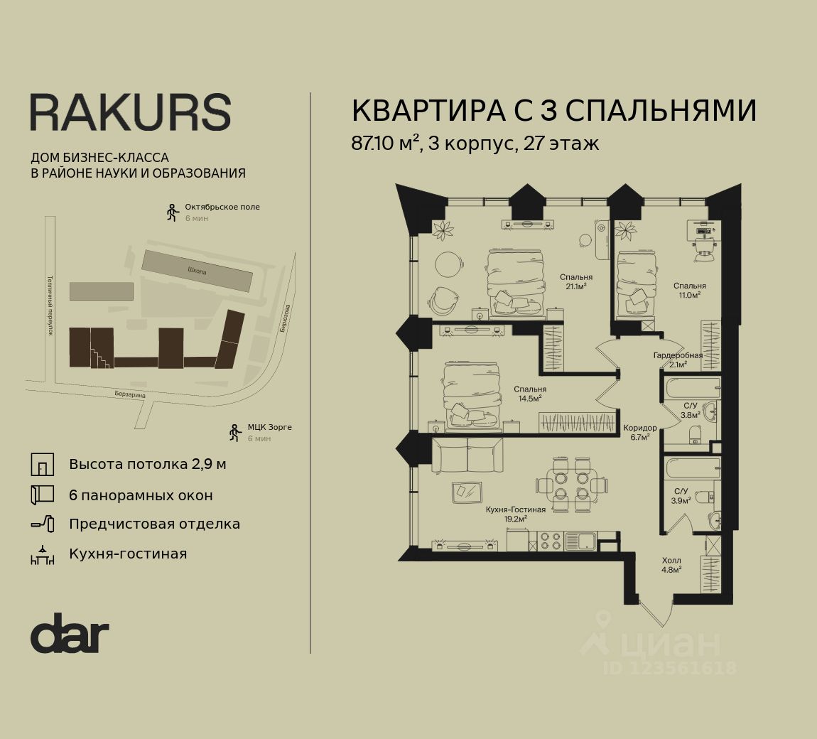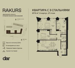 Продаётся 3-комнатная квартира 87.10 м² в жилом комплексе Ракурс. Квартиру отличают панорамное остекление, потолки 2,9 м, улучшенная шумо и воздухоизоляция. Дом сдаётся в 1 квартале 2028 года, продажи проходят через эскроусчета. Подземный паркинг, коворкинг, закрытая благоустроенная территория с фонтаном и артобъектами. Гибкие условия покупки. Rakurs — место, в котором жизнь приглашает к исследованию. Концепция проекта knowledge-centric среда, которая выражается здесь в образе жизни: • атмосфере интеллектуальной среды, • доступности образования, • фокусе на возможности для развития. RAKURS разместился в районе науки и окружен исследовательскими институтами и образовательными учреждениями, при этом на территории построена своя школа с уникальной концепцией. Расположенный на пересечении улиц Маршала Бирюзова и Берзарина, недалеко от станций метро "Октябрьское поле" и "Зорге", дом угождает транспортной доступностью автомобилистам и пешеходам. Инфраструктура же района создана с заботой о людях: здесь много парков, кафе и других уютных мест для отдыха. В состав комплекса входят три башни высотой 18, 26 и 44 этажа, каждая из которых имеет свой запоминающийся силуэт. Между собой башни связаны среднеэтажными строениями с индивидуальными фасадами. Композиция и пластика корпусов, а также панорамное остекление башен обеспечивают квартиры максимальным количеством дневного света и выигрышными видами на центр города и Москву-Сити. Упор на функциональность не лишает проект его уникального образа — все башни имеют неординарную форму с харизматичными уступами и консолями. Rakurs предлагает широкий выбор уникальных вариантов жилья — от студий до эксклюзивных квартир с приватными террасами. Проект спроектирован с фокусом на биофильность и функциональность. Во дворах Rakurs можно насладиться завтраком на террасе кафе, игрой с детьми или спортом на свежем воздухе. В Rakurse cвой комьюнити-центр - многофункциональное пространство для работы, отдыха, общения и развития. Одна из важнейших частей центра — частная библиотека с лаундж-зоной. Книжный фонд отбирается для нее кураторской командой, а дизайн пространства сделан так, чтобы жители могли почувствовать умиротворяющую атмосферу библиотечного зала. Идея knowledge-centric среды поддерживается здесь и книжным магазином с лекторием, а также зонами для самостоятельной учебы и занятий с преподавателями.
