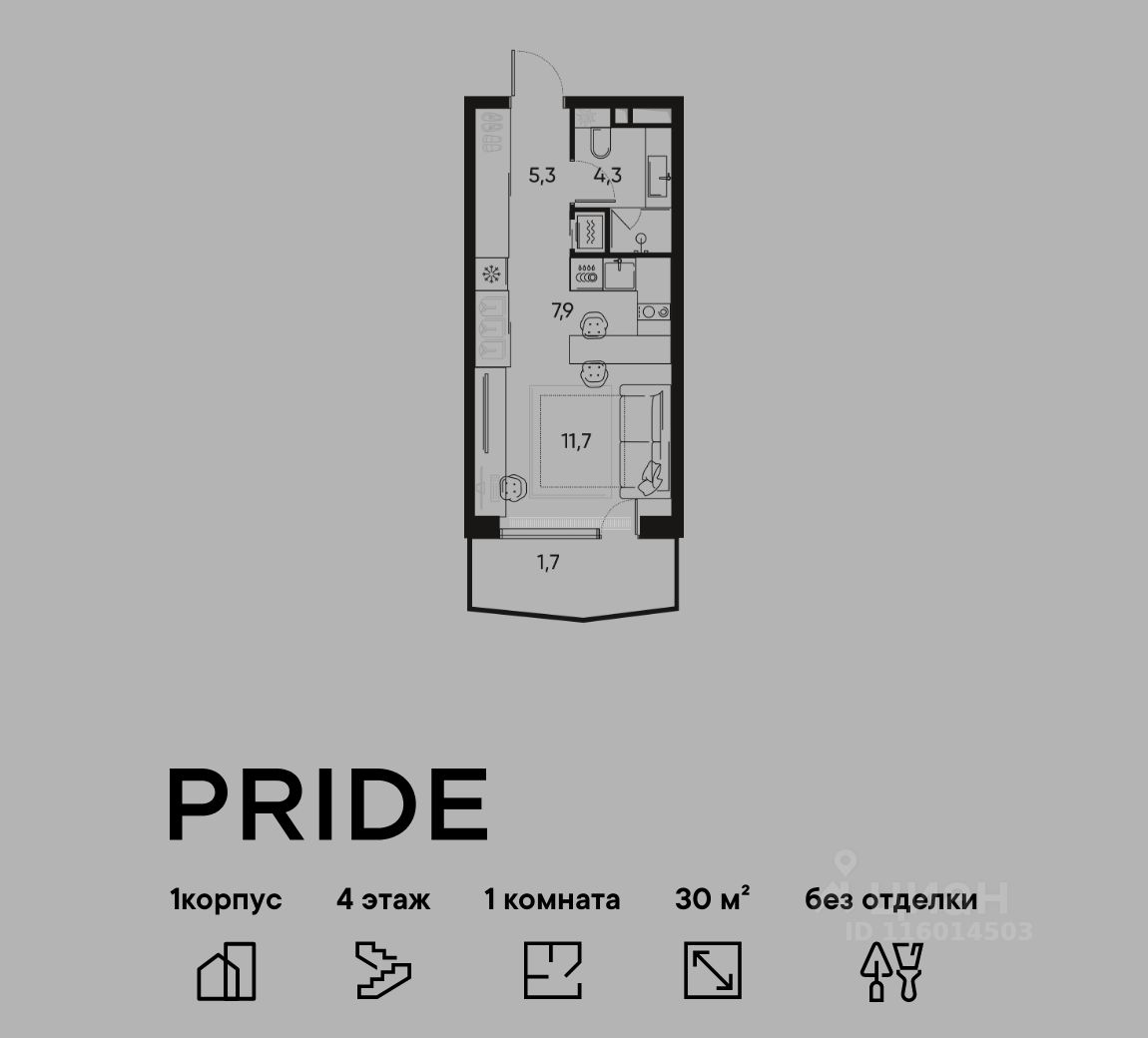 В премиальном жилом квартале PRIDE продается 1 - комнатная квартира - студия в 1 корпусе, на 4 этаже, в секции 10. Её общая площадь составляет 30 м². Пространство включает зону для отдыха 11,7 м², уютную кухню 7,9 м², и ванную комнату 4,2 м². Ключи в 2026 году.
