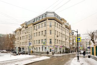Объект культурного наследия. Доходный дом на углу Большой Бронной и Богословского переулка достроен в 1914 году по проекту Густава Андреевича (Густав Карл Юлиус Адольф) Гельриха русского архитектора немецкого происхождения, крупного мастера московского модерна. По архивным данным, сначала 2-х этажный дом построил в 1910 г. арх. Г. Дуганов. Оформление фасадов скромное, все-таки здание построено в годы войны. Стены, начиная со второго этажа, облицованы керамической плиткой кабанчик. Вдоль всего фасада проходят тонкие фризы из глазурованной плитки зеленовато-оливкового, а на уровне четвертого этажа и под самой крышей — синего цвета. Пятый мансардный этаж достроен уже в нашем веке. По воспоминаниям современников в 19101911 годах в этом доме жил поэт М. Волошин.