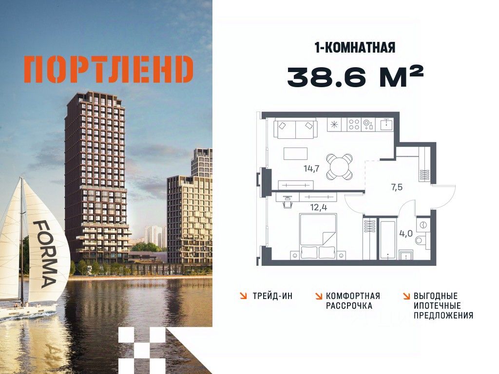 Продаётся 1-к. квартира, 19 этаж в жилом комплексе бизнес-класса ПОРТЛЕНД от девелопера FORMA. ЖК расположен на берегу Москвы-реки в северной части района Печатники в акватории Южного речного порта.