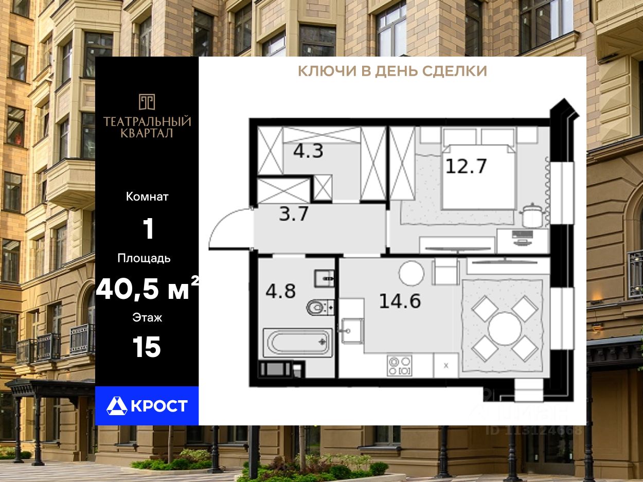 Площадь квартиры составляет 40,50 кв.м и находится на 15-ом этаже 19-этажного здания. Концепция комплекса вдохновлена театральной тематикой, предлагая сочетание неоклассической архитектуры с оригинальной отделкой холлов, изысканными фасадами и созданием культурно-просветительского пространства.