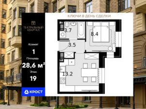 Площадь квартиры составляет 28,60 кв.м и находится на 19-ом этаже 19-этажного здания. Концепция комплекса вдохновлена театральной тематикой, предлагая сочетание неоклассической архитектуры с оригинальной отделкой холлов, изысканными фасадами и созданием культурно-просветительского пространства.