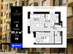 Площадь квартиры составляет 59,60 кв.м и находится на 19-ом этаже 19-этажного здания. Концепция комплекса вдохновлена театральной тематикой, предлагая сочетание неоклассической архитектуры с оригинальной отделкой холлов, изысканными фасадами и созданием культурно-просветительского пространства.
