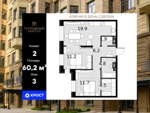 Площадь квартиры составляет 60,20 кв.м и находится на 3-ом этаже 19-этажного здания. Концепция комплекса вдохновлена театральной тематикой, предлагая сочетание неоклассической архитектуры с оригинальной отделкой холлов, изысканными фасадами и созданием культурно-просветительского пространства.