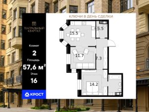 Площадь квартиры составляет 57,60 кв.м и находится на 16-ом этаже 19-этажного здания. Концепция комплекса вдохновлена театральной тематикой, предлагая сочетание неоклассической архитектуры с оригинальной отделкой холлов, изысканными фасадами и созданием культурно-просветительского пространства.