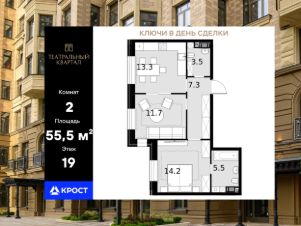 Площадь квартиры составляет 55,50 кв.м и находится на 19-ом этаже 19-этажного здания. Концепция комплекса вдохновлена театральной тематикой, предлагая сочетание неоклассической архитектуры с оригинальной отделкой холлов, изысканными фасадами и созданием культурно-просветительского пространства.