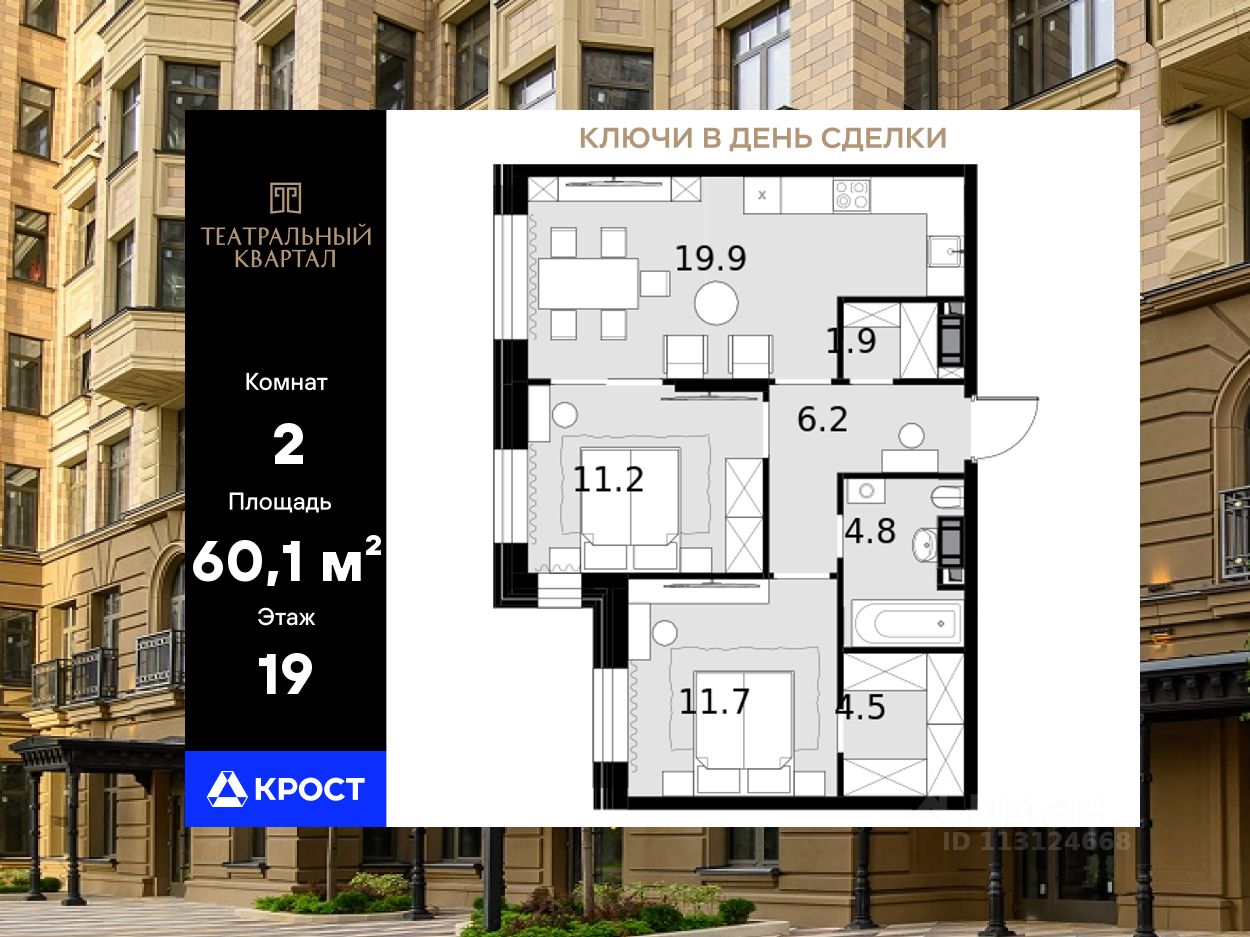 Площадь квартиры составляет 60,10 кв.м и находится на 19-ом этаже 19-этажного здания. Концепция комплекса вдохновлена театральной тематикой, предлагая сочетание неоклассической архитектуры с оригинальной отделкой холлов, изысканными фасадами и созданием культурно-просветительского пространства.