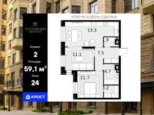 Площадь квартиры составляет 59,10 кв.м и находится на 24-ом этаже 24-этажного здания. Концепция комплекса вдохновлена театральной тематикой, предлагая сочетание неоклассической архитектуры с оригинальной отделкой холлов, изысканными фасадами и созданием культурно-просветительского пространства.