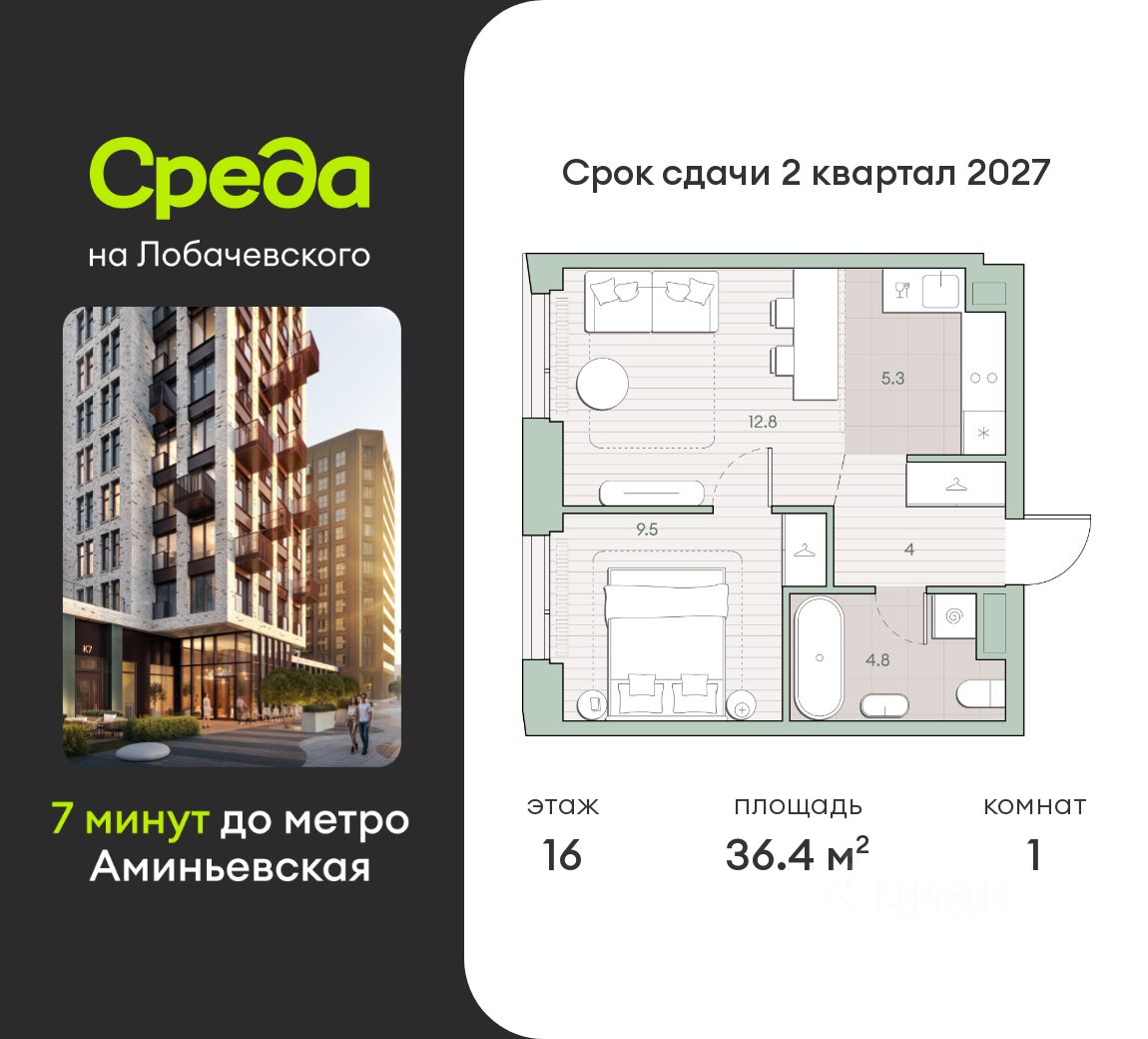 Продаётся 1-комнатная квартира общей площадью 36.4 кв.м. с отделкой white box. Квартира расположена на 16 этаже корпуса 5.4 в жилом комплексе бизнес-класса "Среда на Лобачевского" в пешей доступности от метро "Аминьевская".