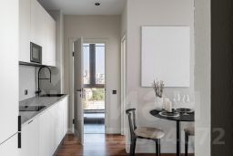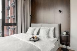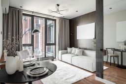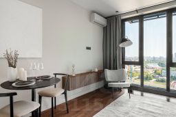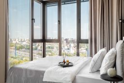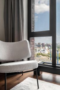 Единственное предложение в районе с панорамным остеклением в пол по всему периметру апартаментов с четырьмя панорамными окнами: одно в гостиной, два в спальне (угловое) и одно в ванной.