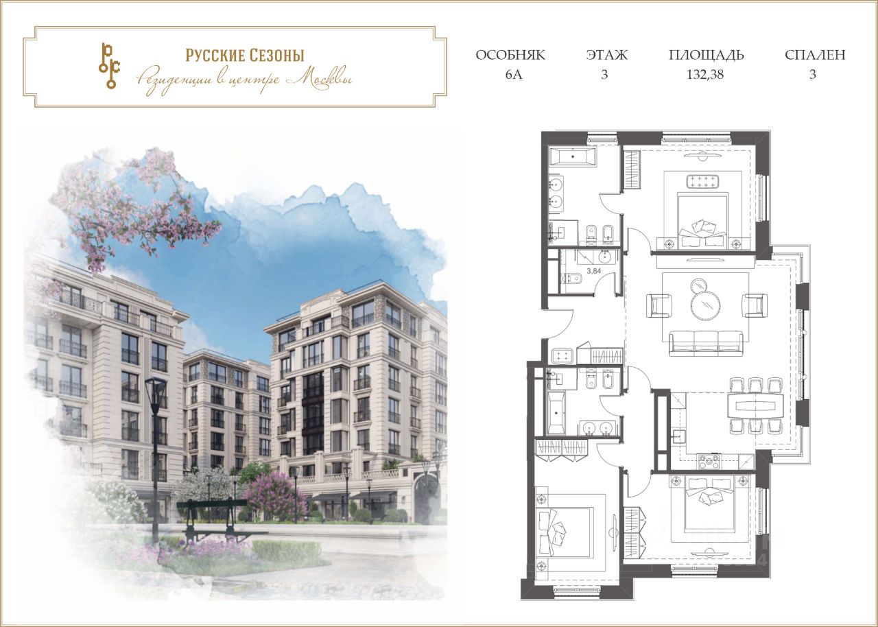 К продаже представлена просторная квартира общей площадью 132,38 кв.м, расположенная на 3 этаже корпуса 6А. За счет трехсторонней ориентации и панорамных окон в пол, достигающих в высоту 2,8 метров, а в ширину до 4х метров, в квартире всегда светло и уютно. Из гостиной, объединенной с кухней-столовой, выходят на внутреннюю территорию комплекса с незабываемой архитектурой. Окна мастер-спальни обращены к тихому внутреннему дворику комплекса с авторским ландшафтом, фонтанами и дизайнерским освещением.