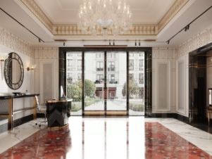 Продаётся просторная светлая квартира общей площадью 168,96 кв.м. Панорамные окна в пол, достигающие в высоту до 2,8 метров, открывают удивительные виды на внутренний парк комплекса с авторским дизайном, фонтаны и садовые группы. Южные окна квартиры обращены к Климентовскому переулку, в то время как из западных окон можно наслаждаться панорамами исторической Москвы и Церковью иконы Божией Матери. Большая площадь остекления, достигающая в некоторых проемах ширины 4 метра, позволяет стереть границы между внутренним и внешним пространством, усиливая связь интерьерного пространства с экстерьерным.