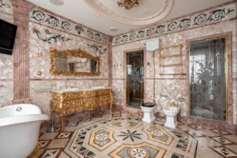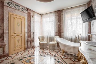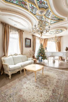 Теперь немного слов о наполнении этого уникального объекта. Вся мебель ручной работы, сантехника, текстиль и предметы интерьера изготовлены в единственном экземпляре, специально для данного проекта. Никакого евроремонта, искусственного глянца, пластика и других современных материалов. Скрупулёзный подход реализован при использовании в оформлении интерьера квартиры: натурального итальянского мрамора, ценных пород дерева, лепнины и витражного остекления на потолке.