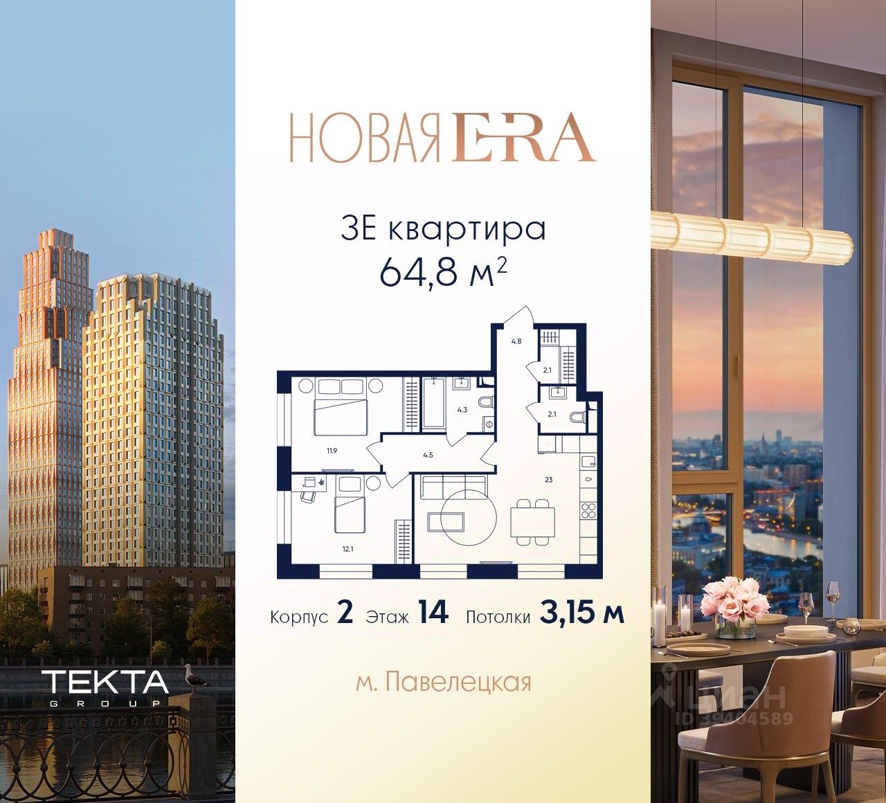 3-комн. квартира в ЖК "Era" на 14 этаже в 32 этажном здании Корпус 2. Общая площадь: 64.8 кв.м., жилая: 38.30 кв.м. Высота потолков 3.15 м.