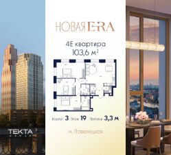 4-комн. квартира в ЖК "Era" на 19 этаже в 33 этажном здании Корпус 3. Общая площадь: 103.6 кв.м., жилая: 63.20 кв.м. Высота потолков 3.30 м.
