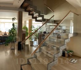 Первый уровень: Удобное зонирование рабочего и жилого пространства: кабинет (45 м2, с отделкой из натурального шпона ценных пород дерева с двумя окнами и балконом) находится при входе в квартиру, далее располагается просторная студия (106 м2, гостиная + обеденная зона + кухня со встроенной техникой), встроенные шкафы, гостевой санузел. Дизайн лестницы гармонично вписывается в интерьер, не утяжеляет его, благодаря стеклянным вставкам.