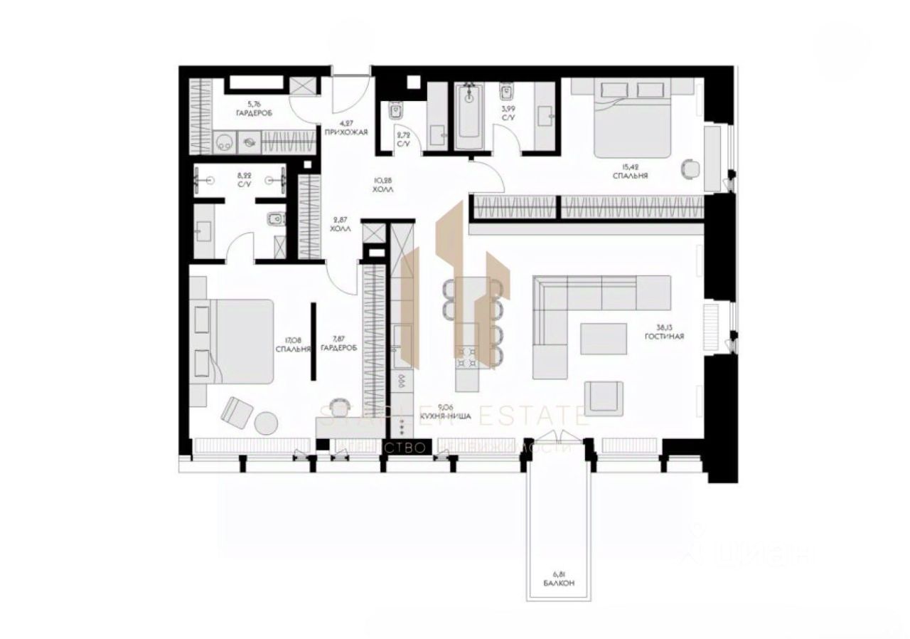 - главная спальня с просторной гардеробной и ванной комнатой;