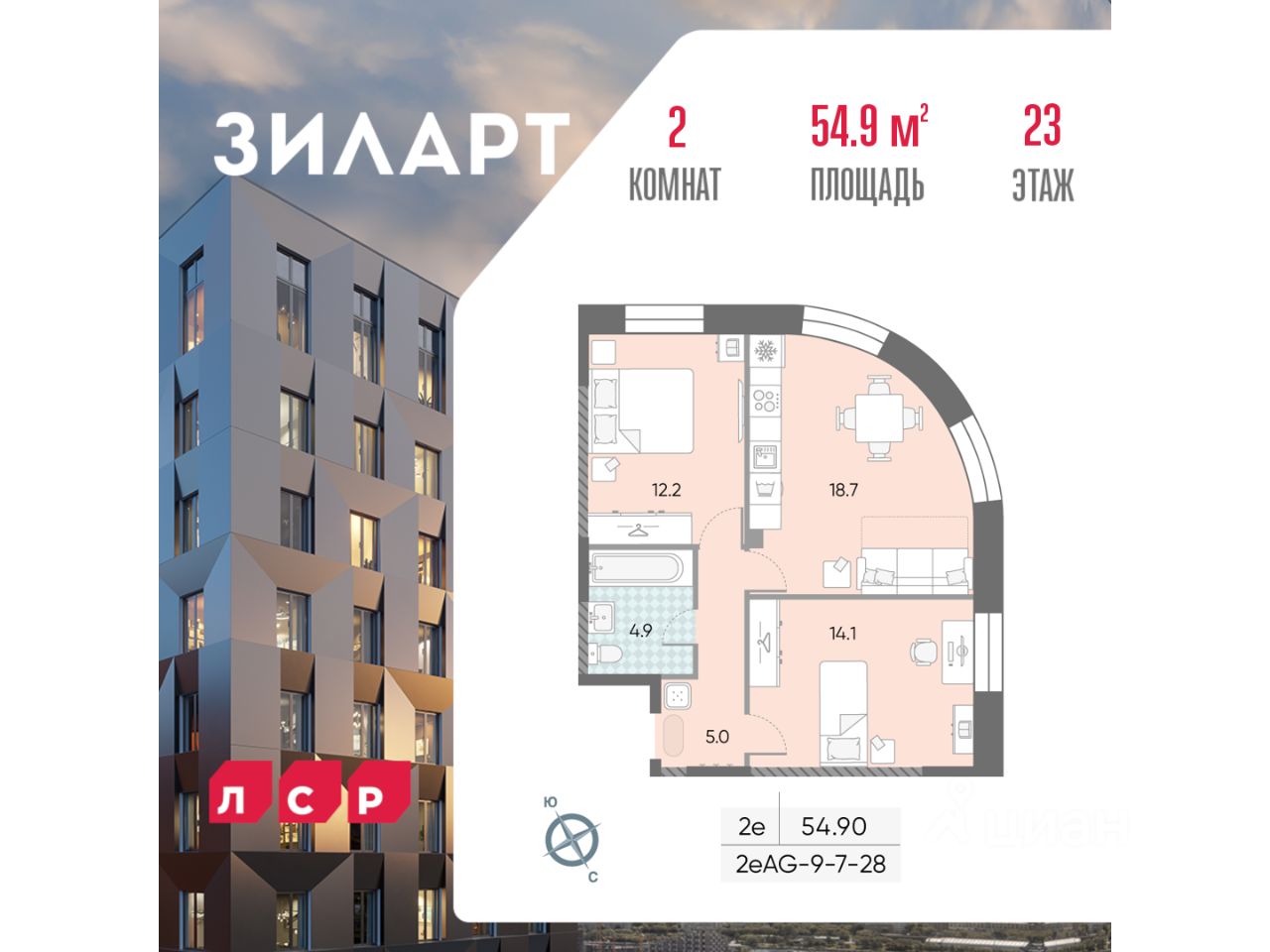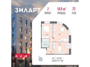 Продаётся 2-комнатная квартира в доме 18 (ЗИЛАРТ ГРАНД) ЖК "ЗИЛАРТ" общей площадью 54.9 кв. метров на 23 этаже.