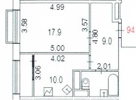 Общая площадь 41,5 м². Комната 17,9 м², кухня 10 м² с отапливаемой лоджией, просторная прихожая с нишей под гардеробную. Возможна перепланировка в евро-двухкомнатную квартиру.