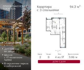 Квартира на 4 этаже в жилом комплексе премиум-класса "Преображенская площадь". Общая площадь: 94.2 кв.м.