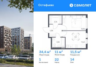 Предлагается 1-комнатная квартира комфорт-класса 34,44 кв.м в корпусе 22 на 14 этаже, в ЖК "Остафьево"