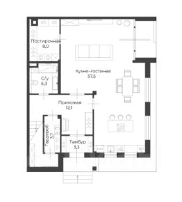 1 этаж: крыльцо, тамбур, холл, кухня, столовая, гостиная с выходом на террасу, санузел,