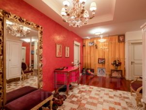 Прихожая с мраморными полами и декорами от Итальянской фабрики Petra Antiqua c яркими стенами, французским комодом цвета спелой малины. Напротив входа за прозрачными стенами и полками из стекла расположена spa-зона.